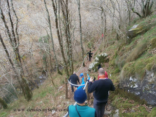 izquierda, salvar el desnivel de ascenso con la ayuda de la maroma y continuar
